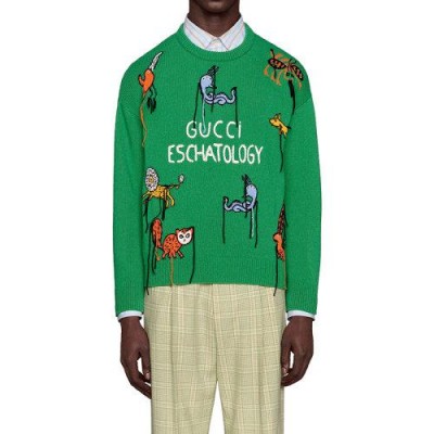 【包稅】GUCCI/古馳21年早秋新款Freya Hartas系列男士綠色羅紋動物印花羊毛毛衣653914XKBYF3129