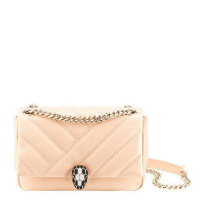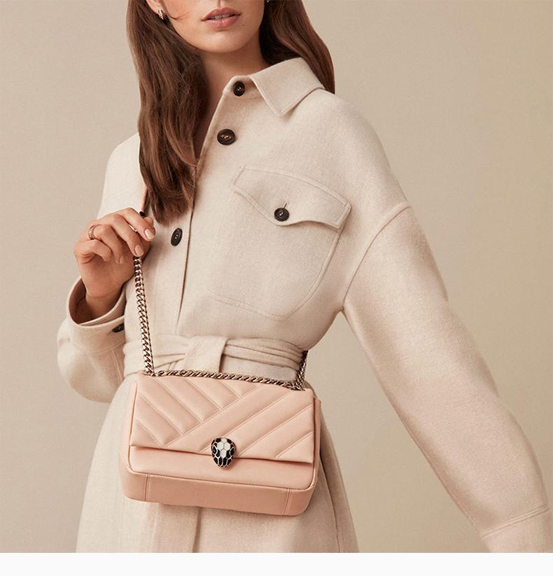 BVLGARI/寶格麗SERPENTI CABOCHON系列女士蜜桃色絎縫小牛皮淺金鍍金黃銅黑白珐琅經典蛇首扣單肩包斜挎包鏈條包女包290612