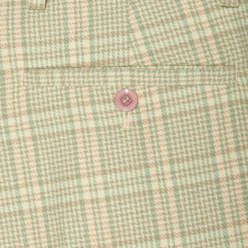 这款羊毛混纺裤子以浅色调的米色和绿色格子呢图案定义,展现出独特的复古感。轮廓前面饰有褶皱,下摆有袖口,呼应了Maison的古老传统,喜欢重温学院风。