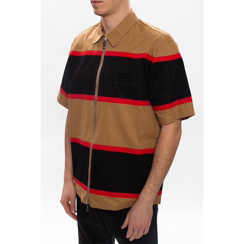 【包郵包稅】BURBERRY/博柏利巴寶莉男裝男士拼色條紋棉質時尚拉鍊方領春夏短袖襯衫80367711