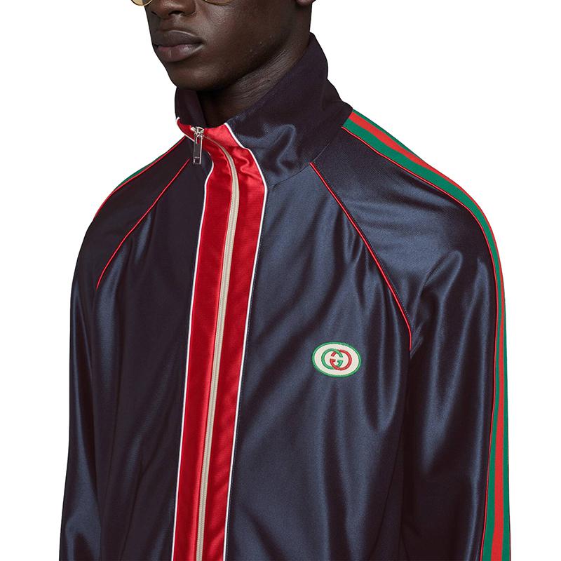 在整个Opening系列中,邀请了违反规范的闪亮面料。这款运动服式夹克采用柔软闪亮的技术涤纶平纹针织面料制成。迷人的深蓝色织物像帆布一样,展示了标志性的细节,例如马术风格的织带和GG细节轭。