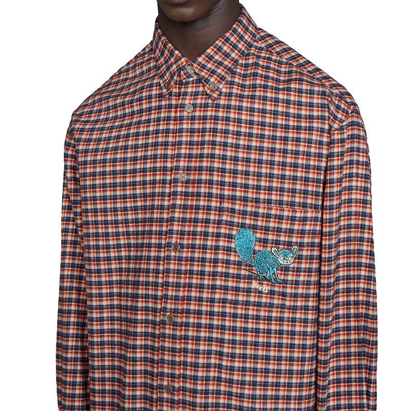 ‎【包稅】GUCCI/古馳21年早秋新款Freya Hartas系列男士紅色和藍色小格紋動物刺繡棉質長袖襯衫660440ZAHB06499