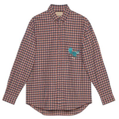 ‎【包税】GUCCI/古驰 21年早秋新款 Freya Hartas系列 男士红色和蓝色小格纹动物刺绣棉质长袖衬衫660440ZAHB06499