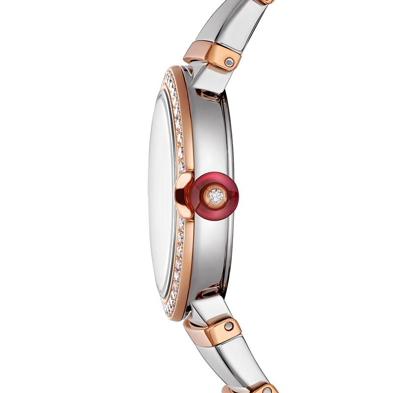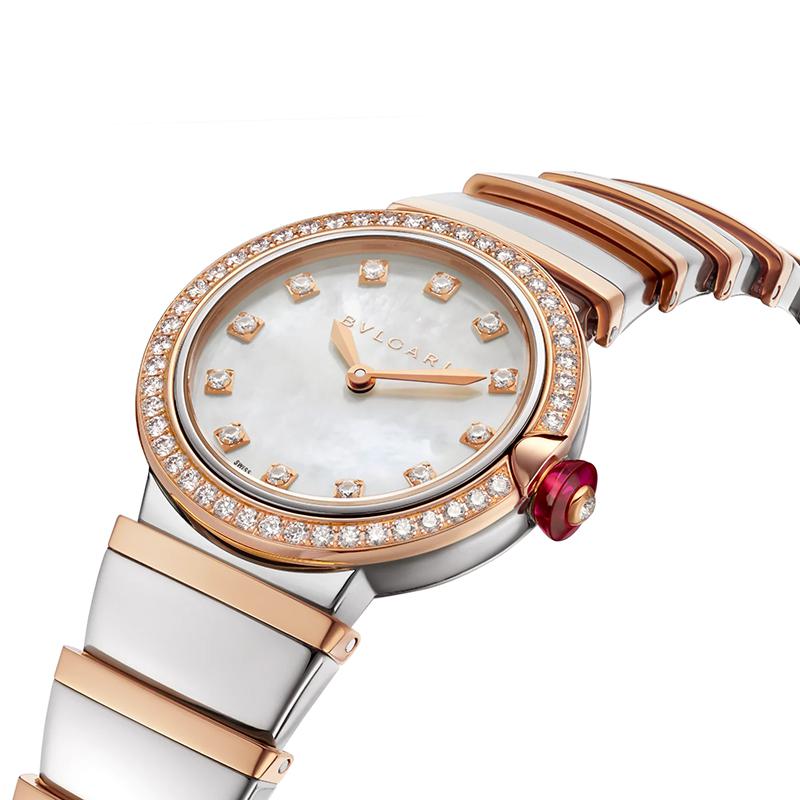 【包税】预定2-3周 BVLGARI/宝格丽 18k金t玫瑰金表圈 镶有明亮式切割钻石 白色珍珠母贝表盘 钻石时标和不锈钢手镯 LVCEA石英手表 28毫米102475