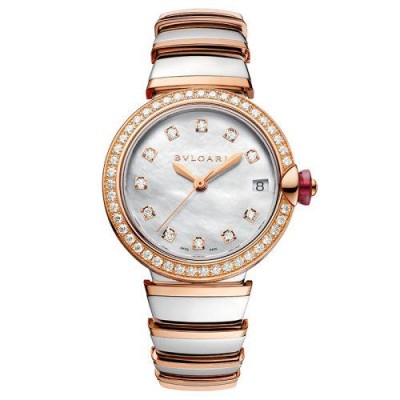 【包稅】預定2-3周BVLGARI/寶格麗錶殼和錶帶由18 K金玫瑰金和不銹鋼製成錶圈鑲有鑽石白色珍珠母貝錶盤鑲有鑽石LVCEA自動機械手錶33毫米102476