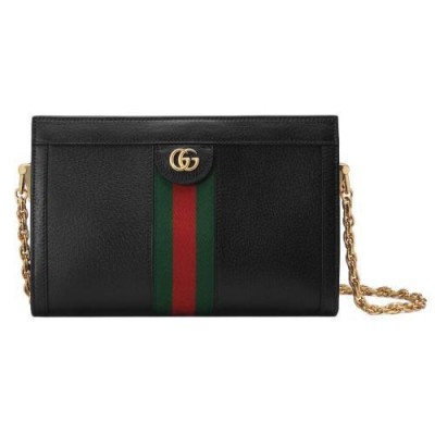 2019早秋系列再添力作,推出全新小号链式Ophidia系列肩背包,选用黑色皮革材质,搭配镶嵌的红绿条纹织带细节。新款设计的正面饰片上饰有小巧玲珑的双G细节,灵感源自70年代Gucci典藏腰带搭扣设计,经现代美学演绎后演化成高贵小巧的样式,打造备受青睐的造型。