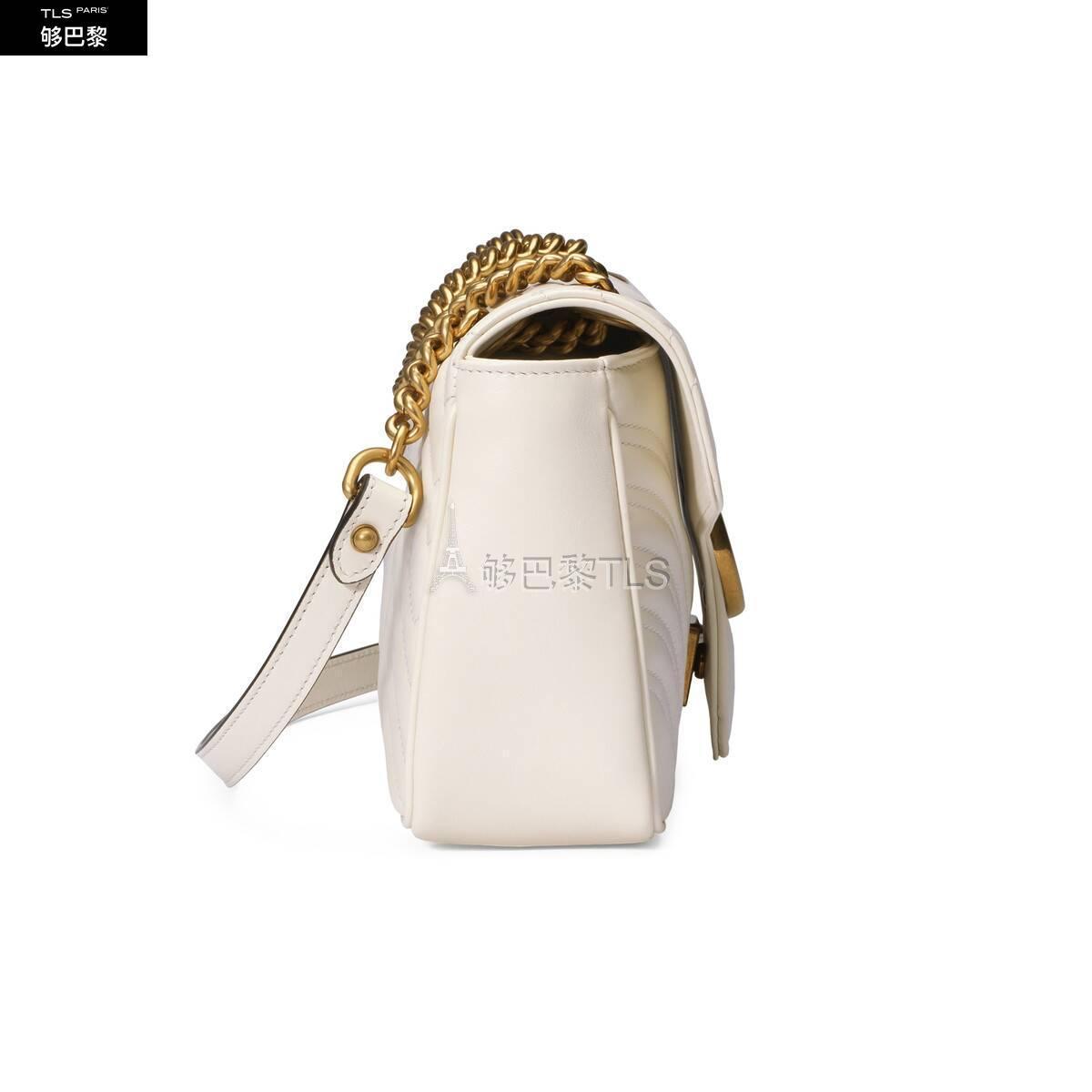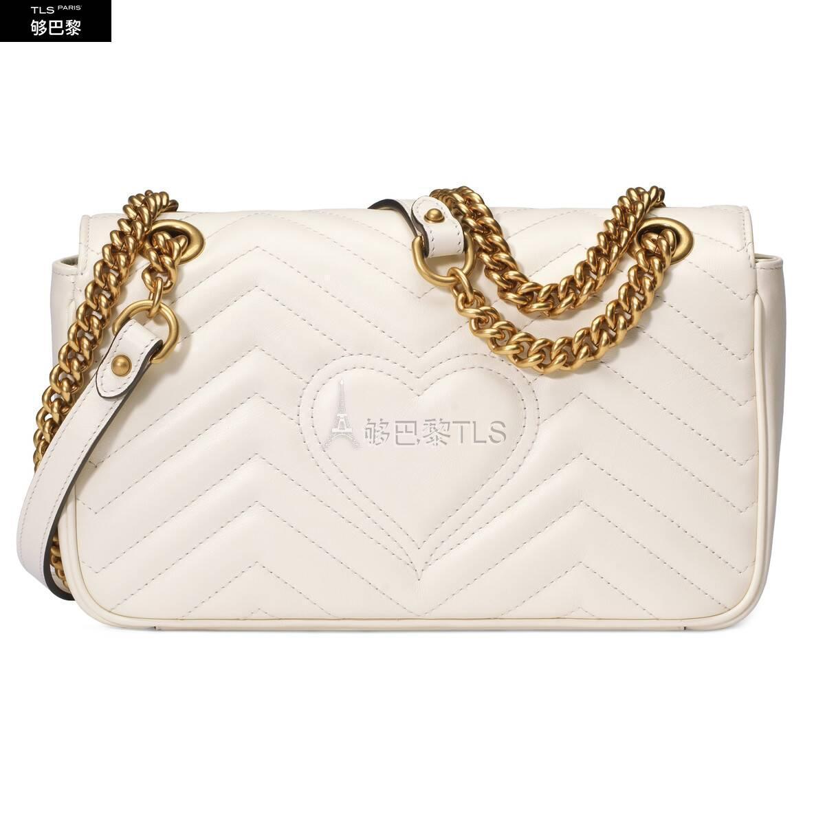 小号GGMarmont链条肩背包采用颇具结构化的柔软造型,超大号翻盖扣配以双G金属配件。滑动链条包带有多种背法,可在肩背和手提之间自由转换。采用绗缝波人形花纹皮革,背面配以心形图案。