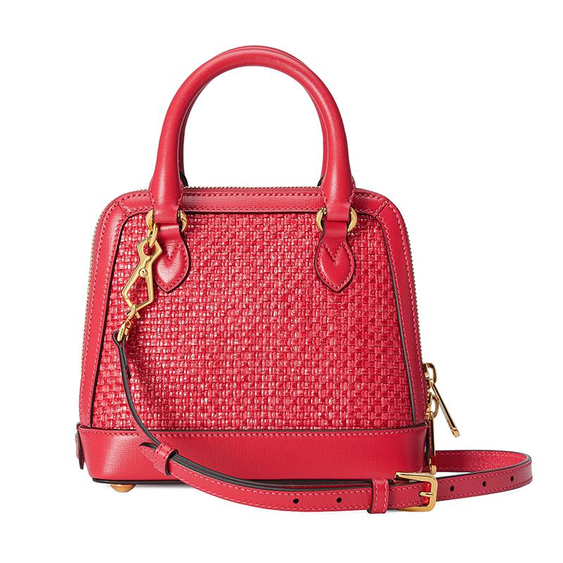 这款迷你手袋采用稻草效果织物和柔软的珊瑚色制成,在一系列具有稻草效果的质感材料中营造出活力的色调,为现代优雅注入了新的定义,贯穿Gucci Horsebit 1955系列。