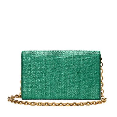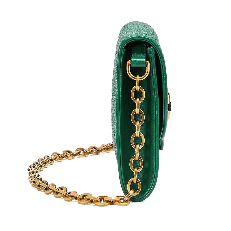 Maison钟爱的系列之一Gucci Horsebit 1955系列的宇宙充满了百搭混合轮廓。单肩包饰有可拆卸链带,眨眼间就变成了手拿包。配件的金色Horsebit细节与翠绿色的稻草效果织物相结合。