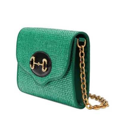 【包稅】GUCCI/古馳2021春夏新款Horsebit 1955系列女士小號翠綠色稻草織物單肩斜挎手拿包6556672VAAX3189