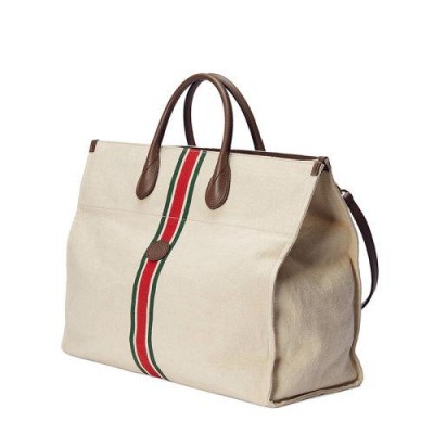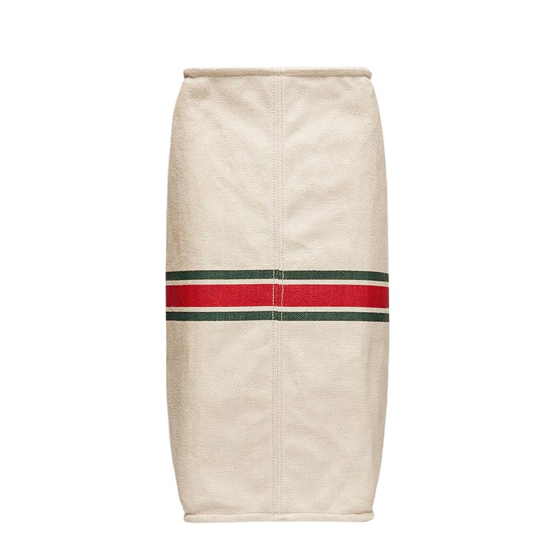 【包稅】GUCCI/古馳21春夏新款pliable系列大號米色亞麻帆布紅綠條紋細節棕色皮革手柄單肩手提包‎6588762U2AG8686