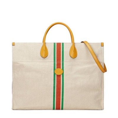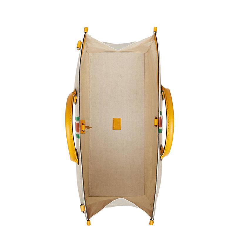 【包税】GUCCI/古驰 21春夏新款pliable系列 大号米色亚麻帆布红绿条纹细节黄色皮革手柄单肩手提包‎‎6588762U2AG8684