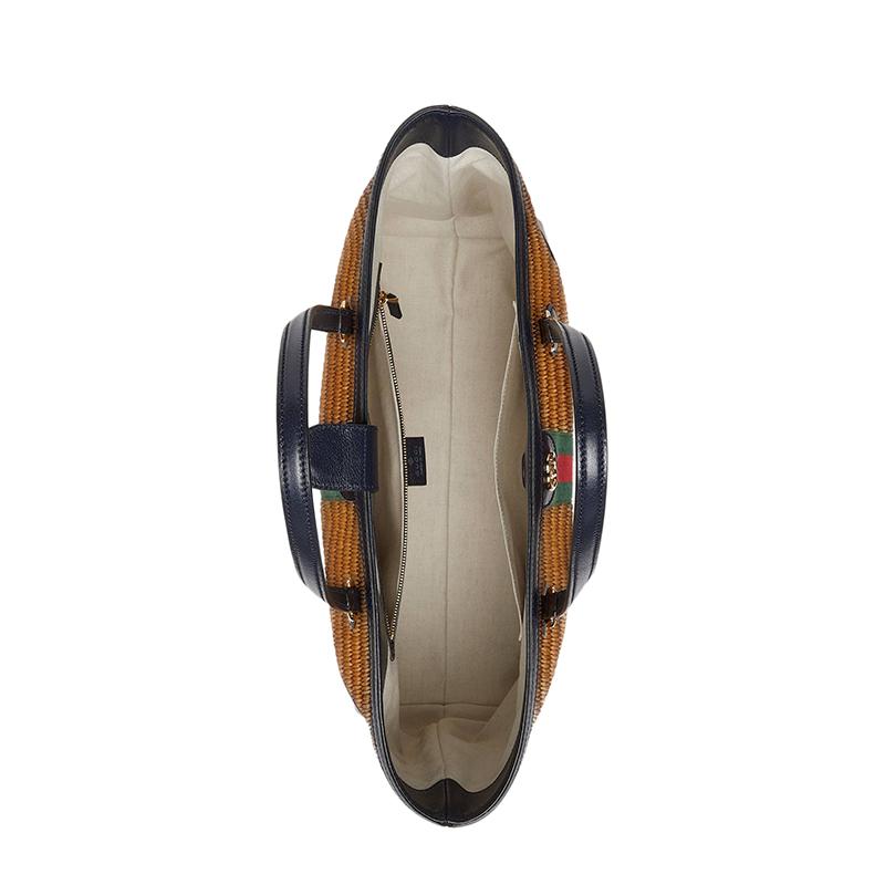 【包税】GUCCI/古驰 21春夏新款Ophidia系列 中号驼色稻草编织蓝色皮革饰边红绿条纹装饰单肩手提包6316852SXFG9368