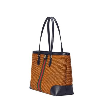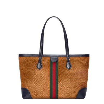 【包稅】GUCCI/古馳21春夏新款Ophidia系列中號駝色稻草編織藍色皮革飾邊紅綠條紋裝潢單肩手提包6316852SXFG9368