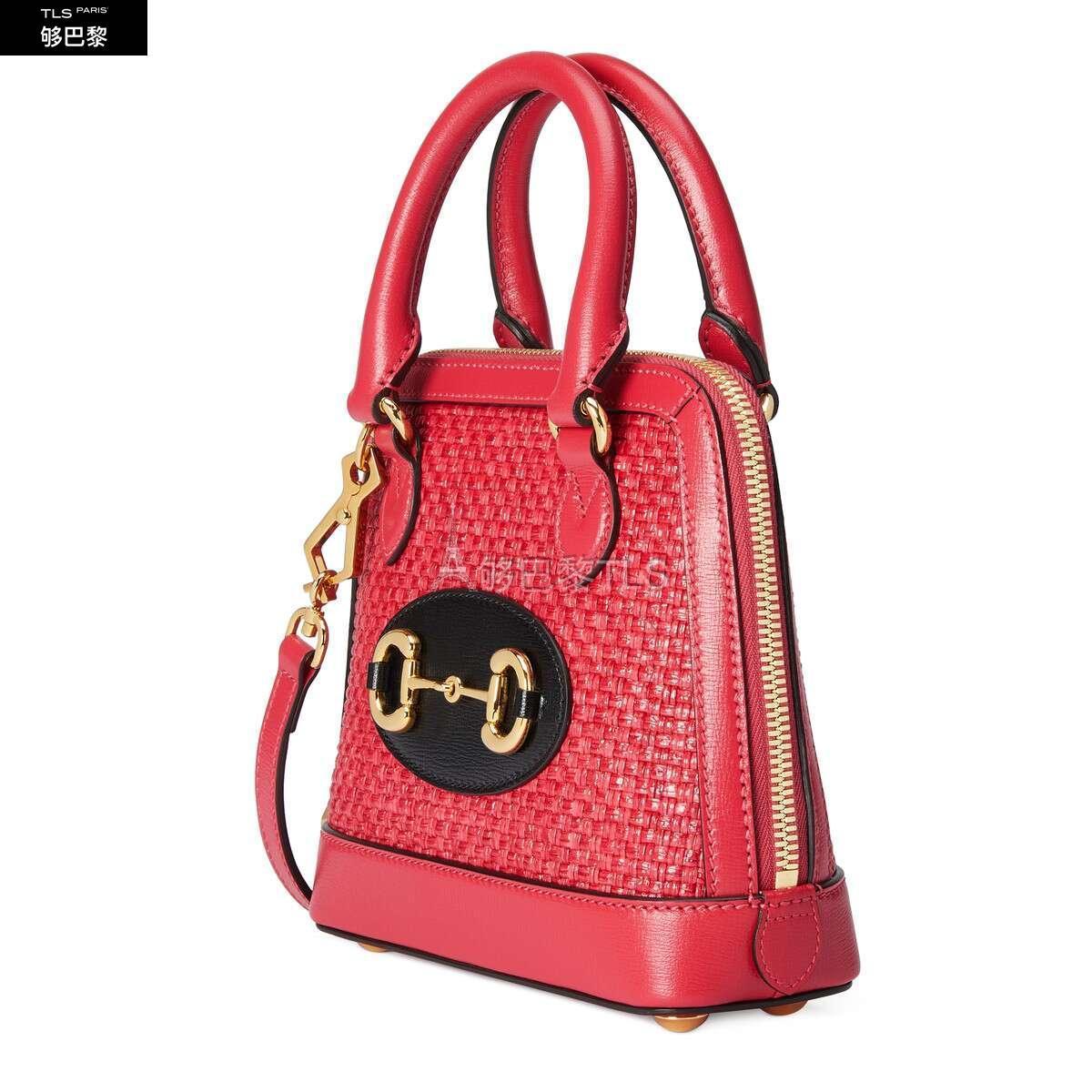 Gucci马衔扣1955系列运用纹理草编效果织物融合鲜艳明快的色调,重塑了对现代优雅的解读。这款迷你手提包采用柔和的珊瑚红色草编效果织物材质制作而成。