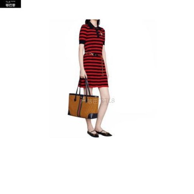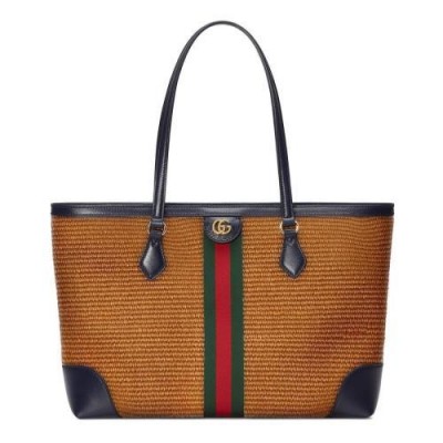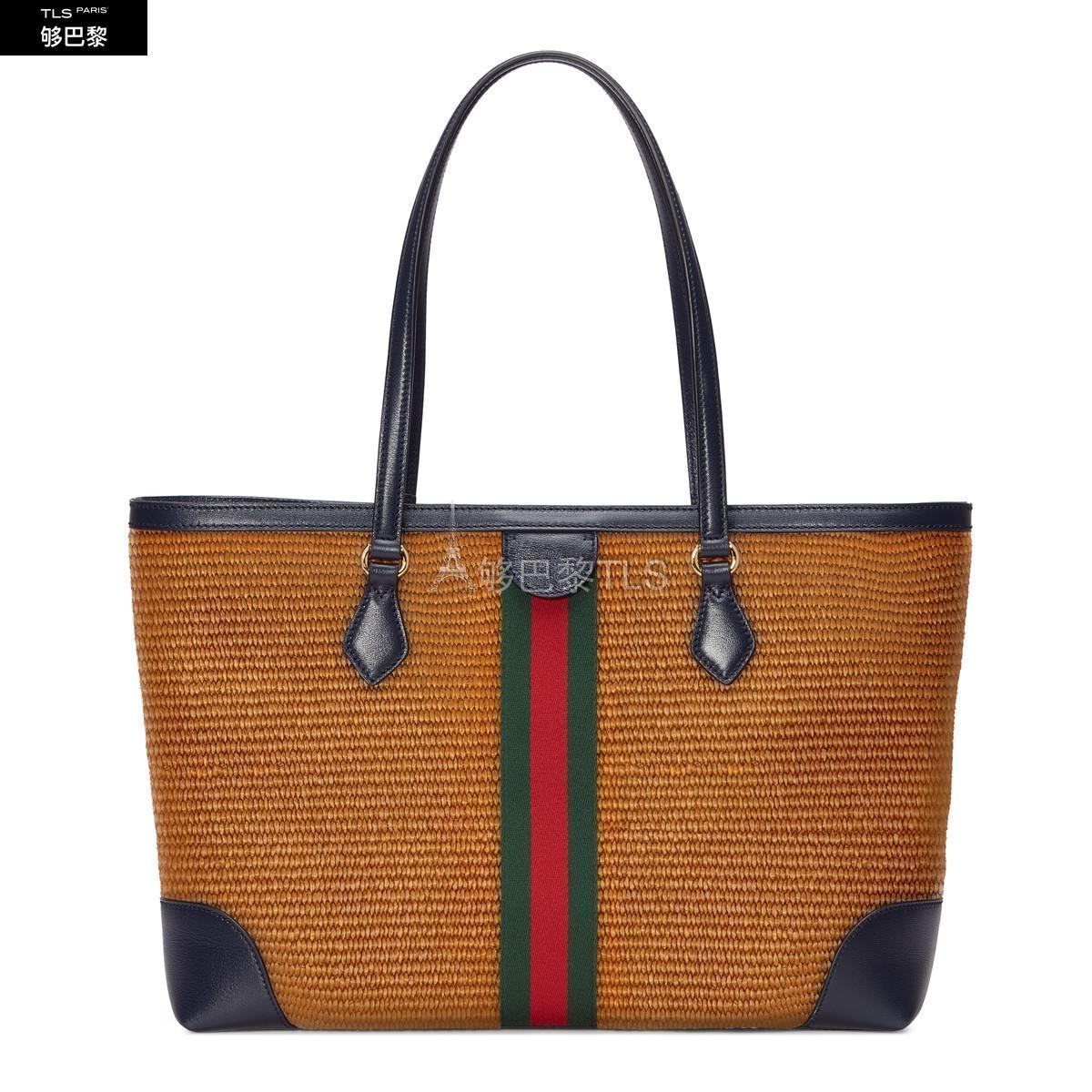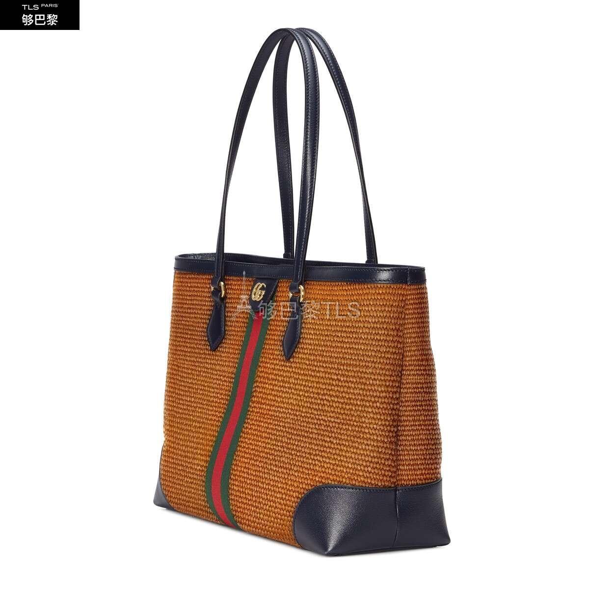 草编效果材质令品牌的标志性设计散发出精致优雅的夏日风情。这款Ophidia系列中号托特包采用驼色配色,搭配品牌经典条纹织带细节。
