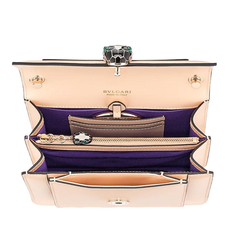 Serpenti Forever肩背包(桃红色小牛皮)和紫水晶紫色罗缎内部衬里。金色黄铜和黑色珐琅标志性Serpenti表扣,孔雀石眼饰玛瑙白色。