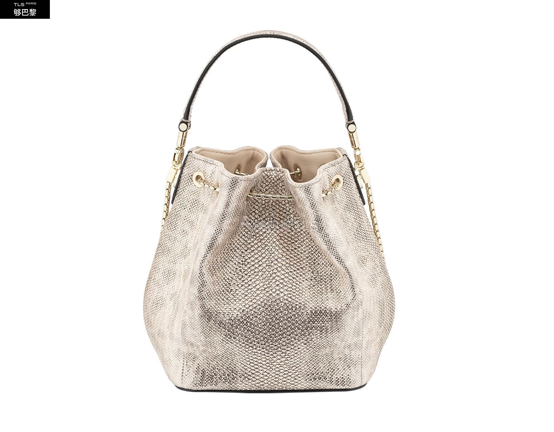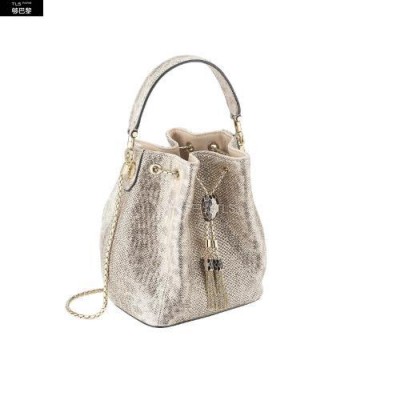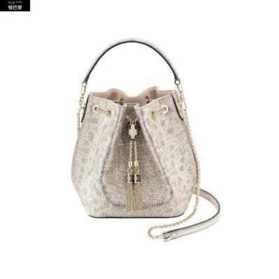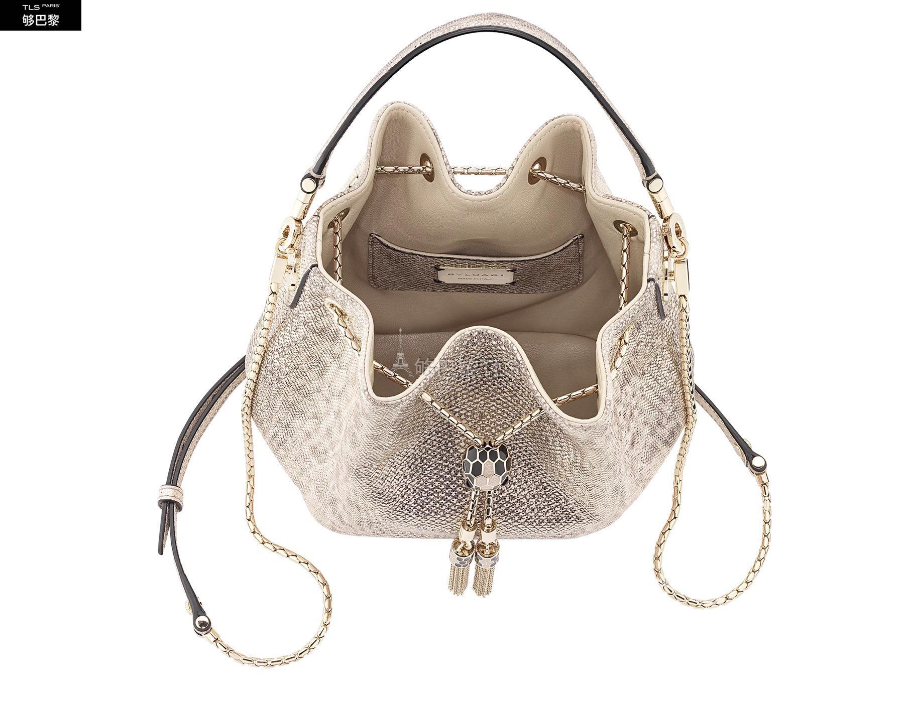 La famille Serpenti Forever accueille un nouveau membre : le sac seau tendance. Ce modele en karung raffine effet metallise couleur Milky Opal illustre la capacite des artisans Bvlgari a transformer des materiaux precieux en des pieces intemporelles. Les cordons fonctionnels de ce sac sont reinterpretes dans le style Bvlgari : ils prennent la forme de chaine a motif en ecailles, completes par le fermoir emblematique Serpenti en email noir et couleur Milky Opal scintillant avec yeux en onyx au cha*W*rme irresistible. L’anse amovible et la chaine en forme de serpent en laiton dore assurent un look confortable et polyvalent. Petit modele dote d’un compartiment a soufflet et d’une plaque en metal ornee du logo Bvlgari a l’interieur. Dimensions : 16 x 19 x 10 cm.