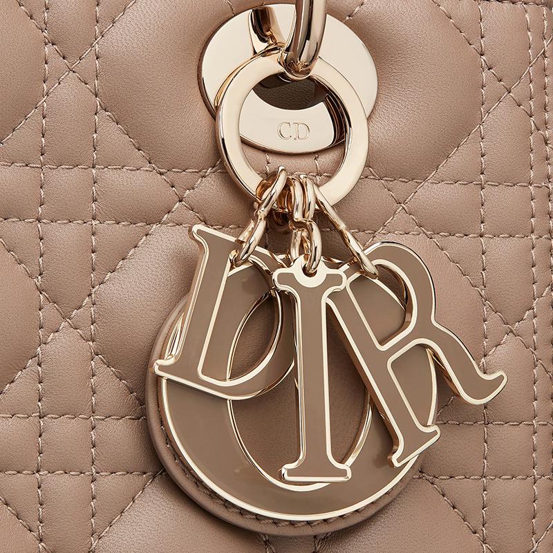 Lady Dior手提包体现了Dior家居优雅和美丽的景象。精致而女性化,这种永恒的创作仍然流行。它采用灰褐色小羊皮和Cannage缝线制成,缝纹理可立即识别。DIOR吊饰以音色珐琅装饰,散发出优雅的魅力。Lady Dior中号手提包配有细细可移动的皮革表带,可以手提在肩上或斜挎包上。