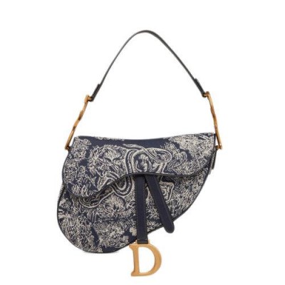 【包稅】DIOR/迪奧21秋冬新款SADDLE系列女士藍色Toile de Jouy圖案反向提花帆布金色D形扣裝潢翻蓋單肩手提馬鞍包M0446CTFO_M928