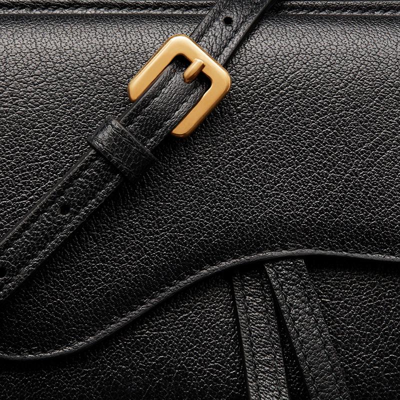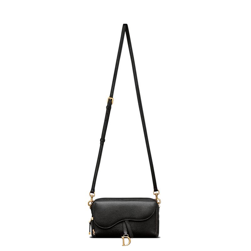 黑色山羊皮迷你手袋采用不对称翻盖和陈年金色金属制成的“ D”字形,代表标志性的Saddle系列标识。此功能性配件可容纳您的日常必需品。可拆卸和可调节的肩带可以用该系列中的刺绣微肩带代替,并且可以戴在肩膀,斜挎包或手上。