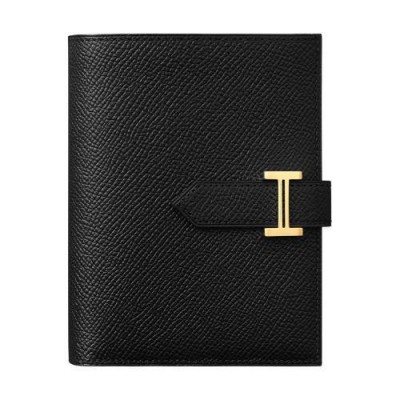 Portefeuille compact en veau Epsom, ferme par une patte en cuir et un fermoir « H » ajoure plaque ora l'interieur : un porte-monnaie avec fermeture a glissiere, quatre poches cartes de credit et quatre poche*esFabrique en France