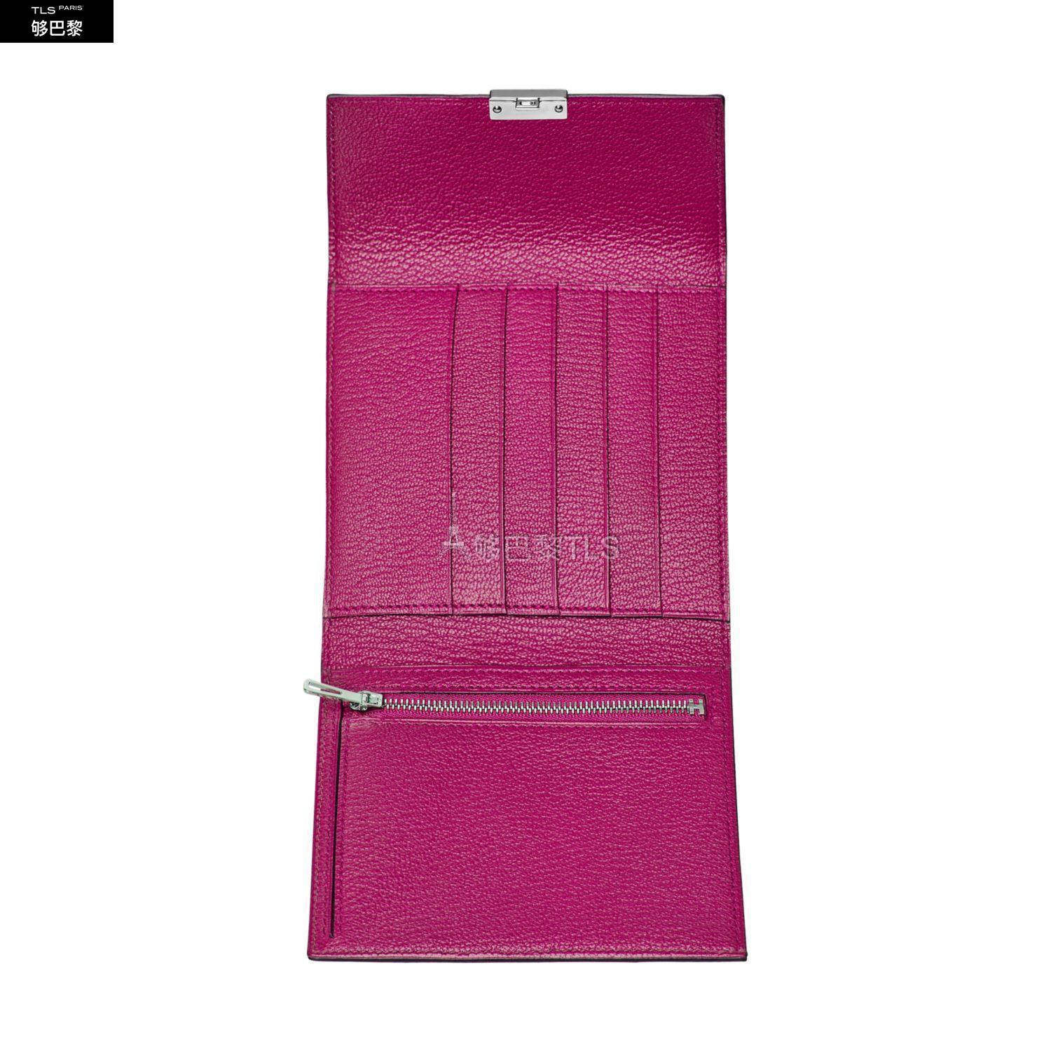 Portefeuille en chevre Mysore, bijouterie argentee palladieea l’interieur : un porte-monnaie avec fermeture a glissiere, cinq poches cartes de credit, une poche carte d’identite, une poche financiereUne ligne aux formats carres qui met en valeur le fermoir inspire des serrures des annees 1960 et de la gravure H raye du cadenas de nos sacs.