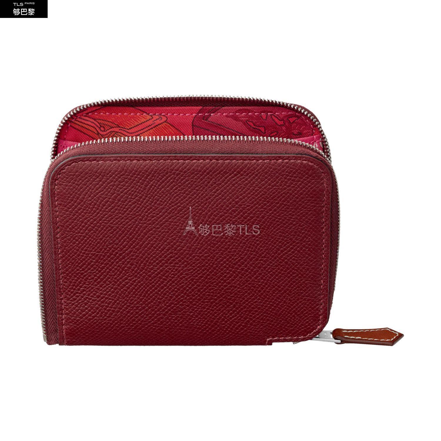 Portefeuille compact zippe en veau Epsom, double en twill de soie imprime « étriers », fermeture a glissiere argentee palladieeA l'interieur : un porte-monnaie zippe, six poches cartes de creditFabrique en France