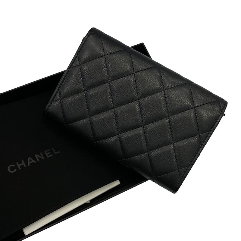 【包税】CHANEL/香奈儿 经典款黑色自然纹理皮革 白色树脂珍珠饰金色金属双C扣钱包