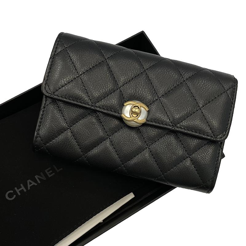 【包稅】CHANEL/香奈兒經典款黑色自然紋理皮革白色樹脂珍珠飾金色金屬雙C扣錢包