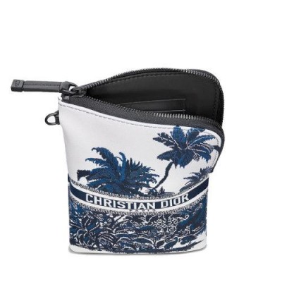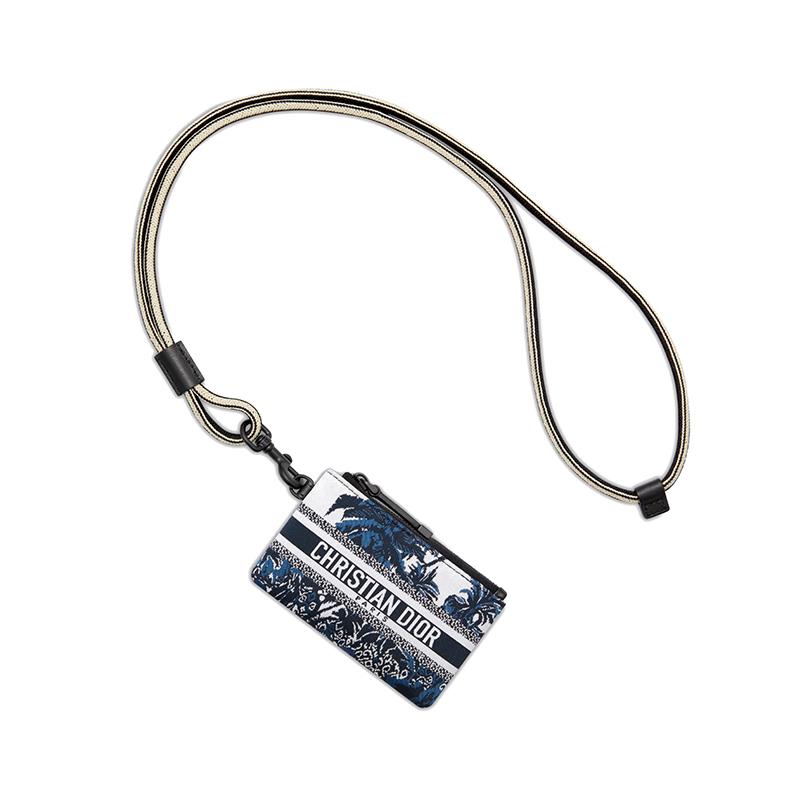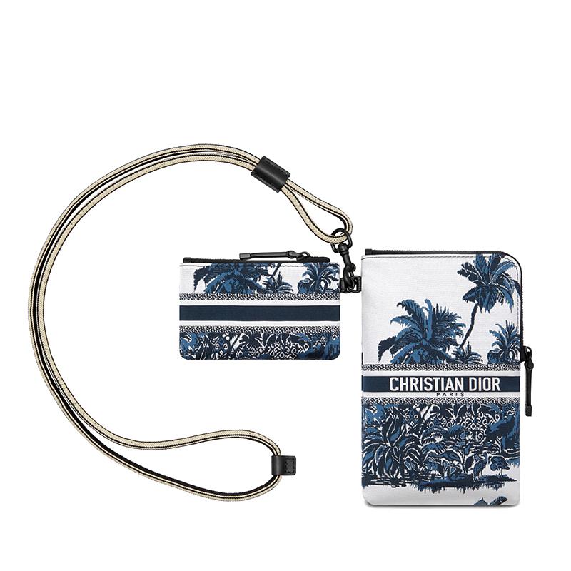 DiorTravel多功能离合器是蓝色技术面料的混合创作,展示了Dior Palms主题,重新诠释了标志性的Toile de Jouy。它由两个可分离的拉链元素组成。小口袋可存放钥匙或找零,而更宽敞的口袋可存放电话。可拆卸的抽绳可将其斜挎在脖子上,也可将其单独放入袋中。