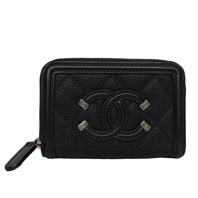【包郵包稅】CHANEL/香奈兒經典款黑色魚子紋小牛皮雙C拉鍊短款錢包