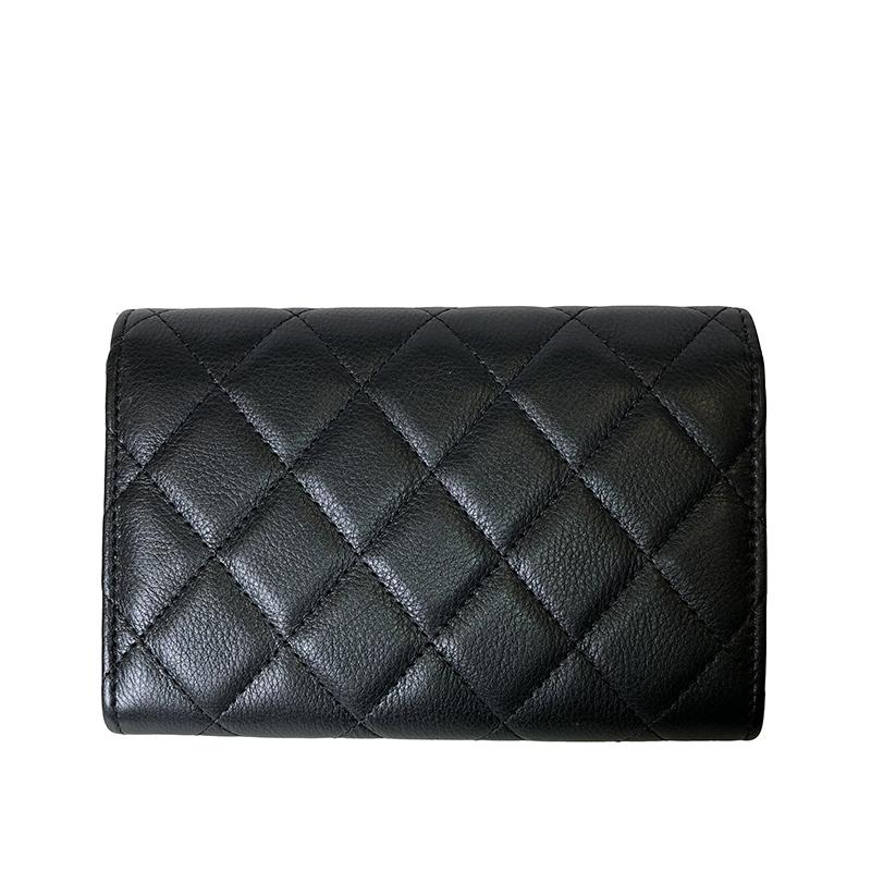 【包郵包稅】CHANEL/香奈兒經典款黑色自然紋理皮革白色樹脂珍珠飾金色金屬雙C扣錢包