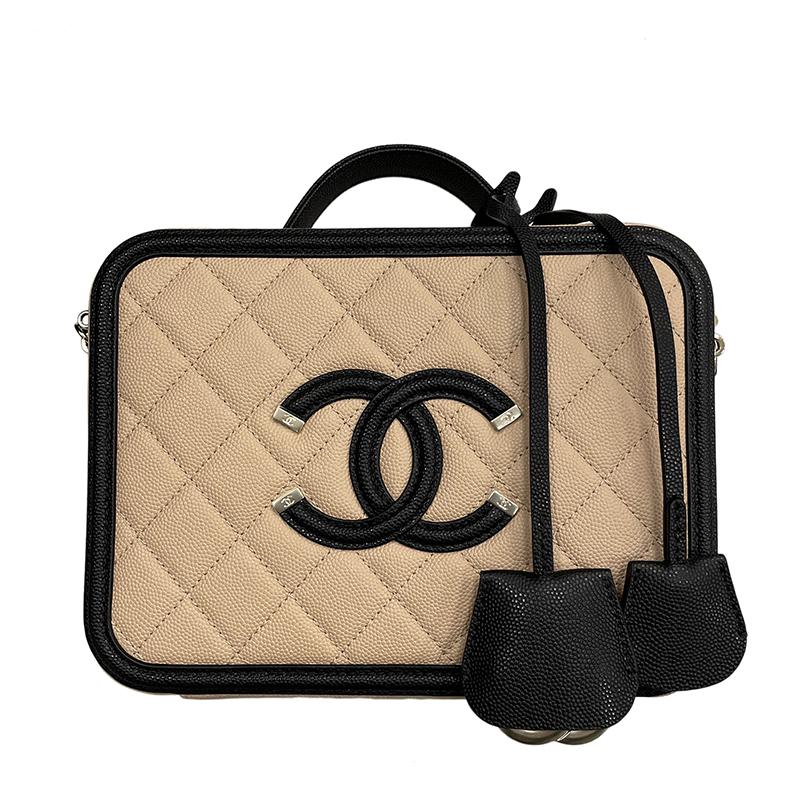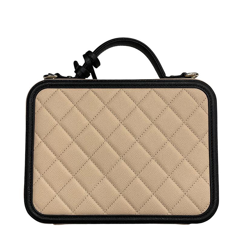 【包稅】現貨CHANEL/香奈兒經典中號Filigree Vanity Case淺米色和黑色魚子醬皮金色五金鏈條化妝箱包單肩包