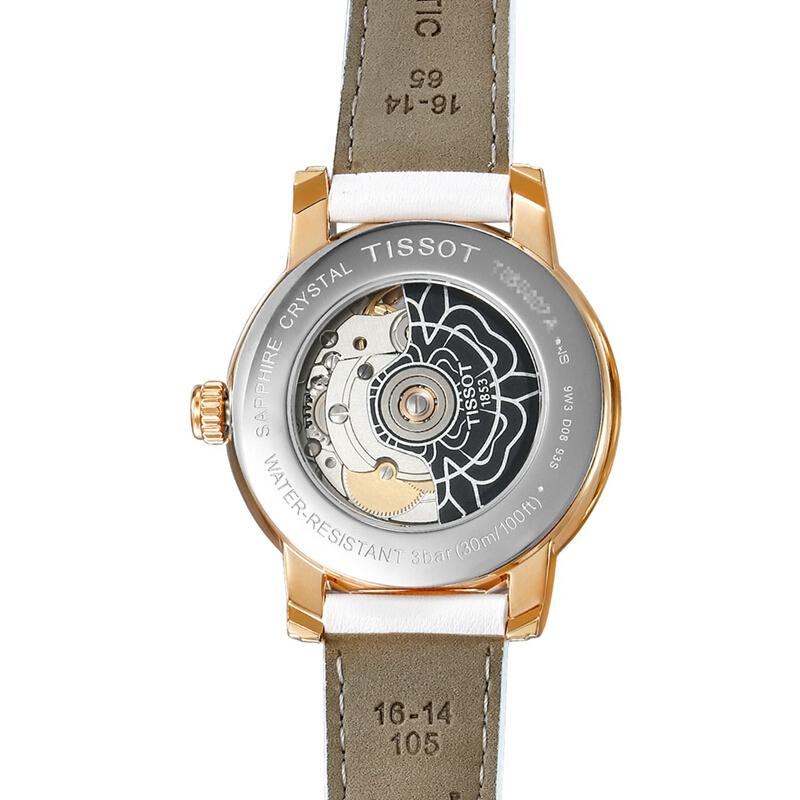 首頁 > 腕表 > 天梭 > 【正品盒裝】TISSOT/天梭心媛系列白盤鍍鏤空數位與條丁刻度白皮帶機械女錶T050.207.37.017.04