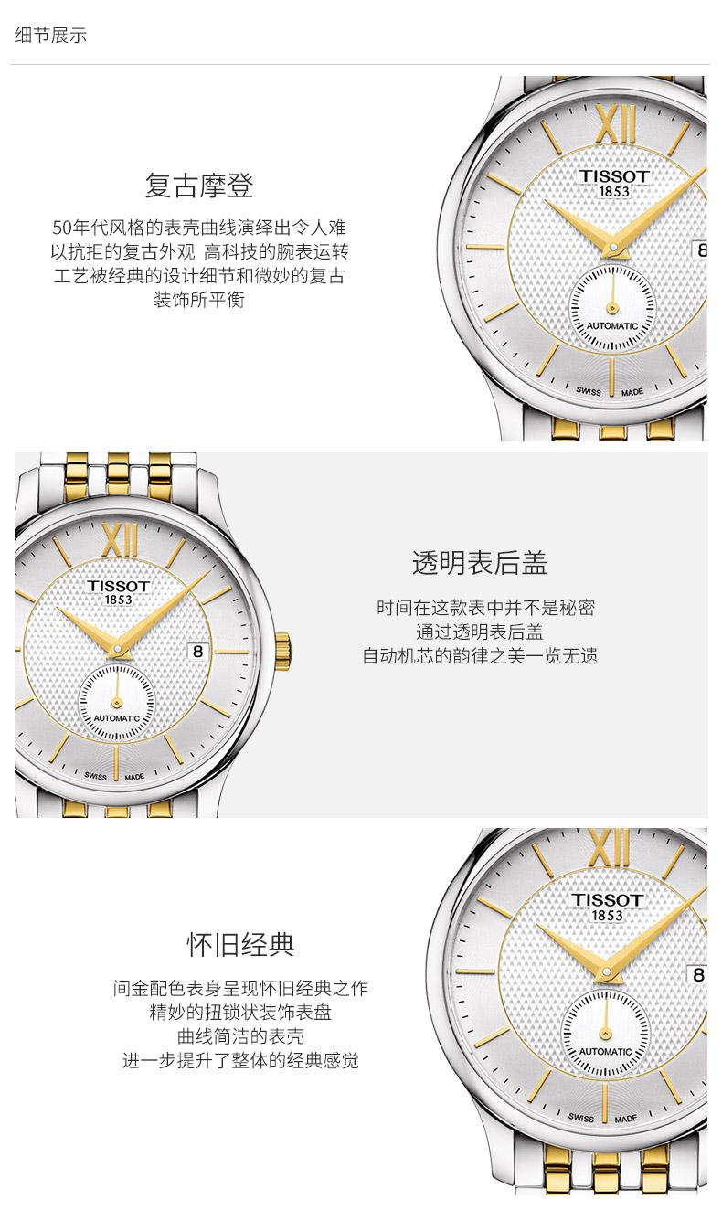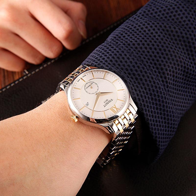 TISSOT/天梭瑞士手錶俊雅系列行事曆自動機械機芯男士腕表間金銀盤T063.428.22.038.00