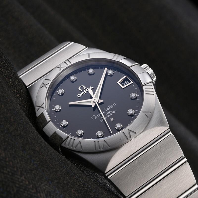OMEGA/欧米茄瑞士手表 星座系列日历镶钻自动机械男士腕表 钢带黑盘123.10.38.21.51.001