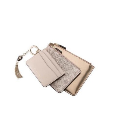 étui Serpenti Forever Trio en cuir de veau couleur Milky Opal, cuir de veau metallise et brosse couleur bronze ancien et karung metallise couleur Milky Opal. Porte-cles mousqueton en laiton dore avec fermoir Serpenti en email noir et couleur Milky Opal avec yeux en email noir. Un etui pour cartes de credit amovible, un etui pour passeport amovible et un porte-monnaie amovible. Dimensions : 16 x 12,5 x 3,5 cm.