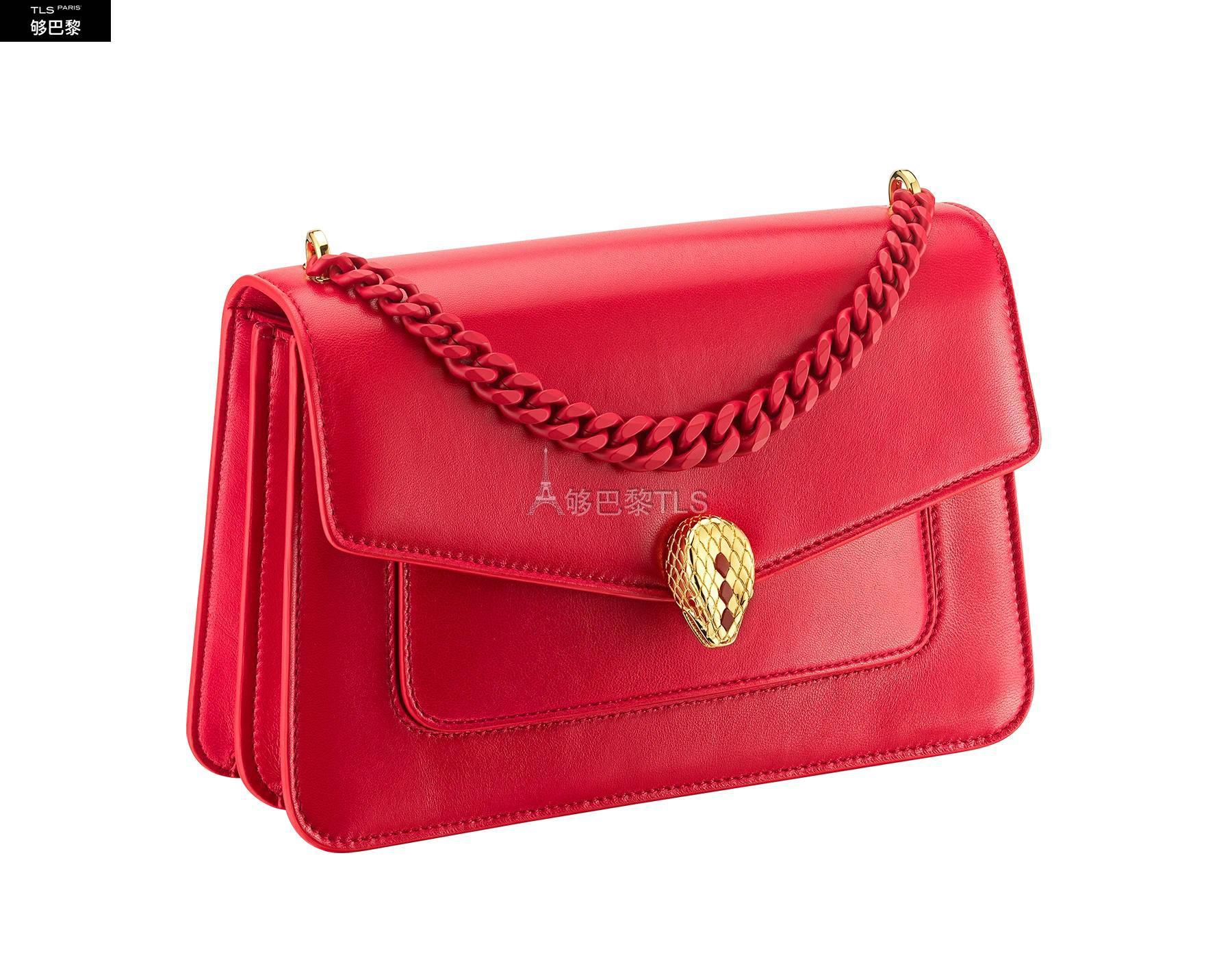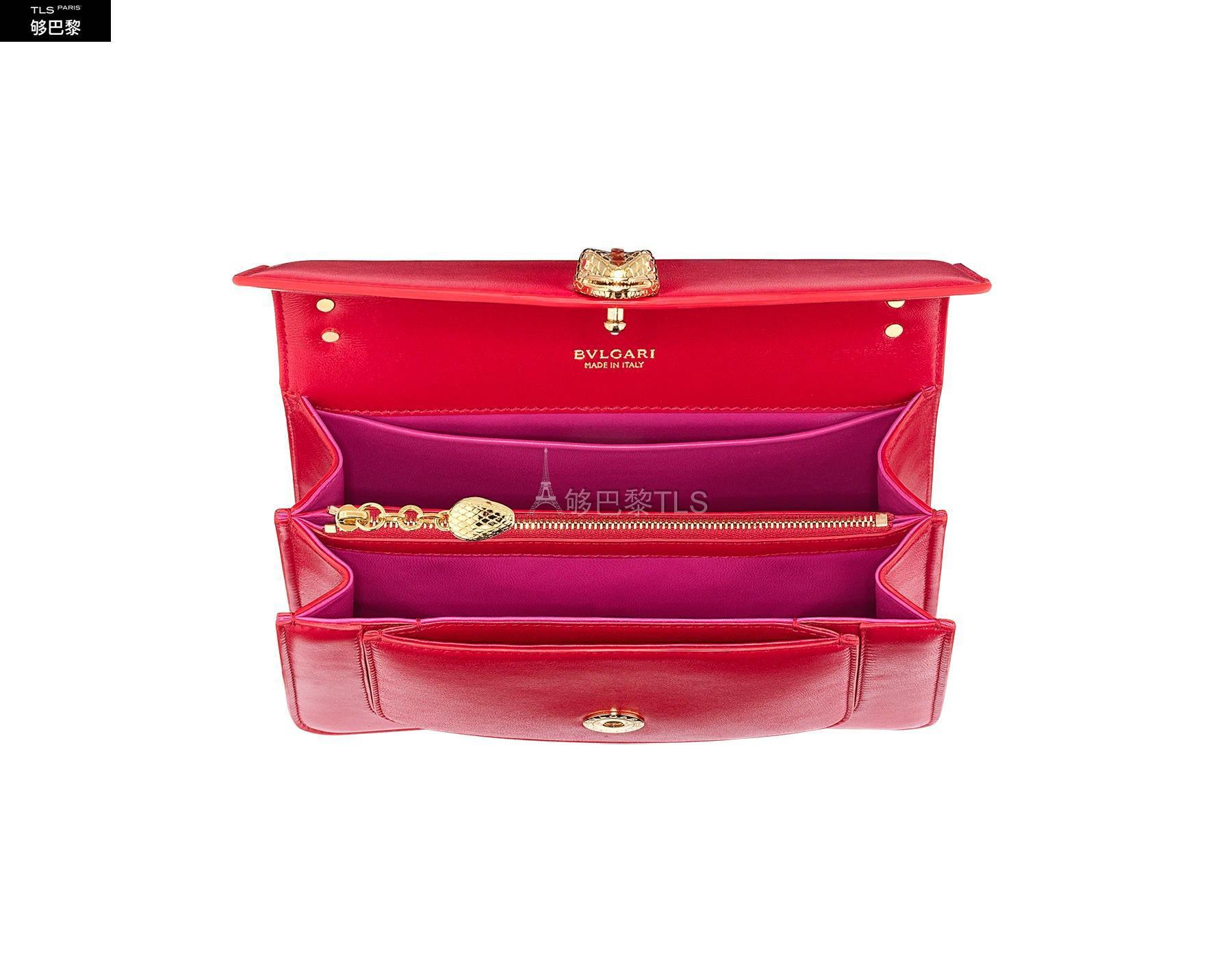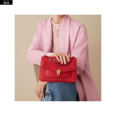 La famille Serpenti Forever accueille un nouveau sac a bandouliere qui affiche une silhouette resolument contemporaine a l’es*W*prit urbain. Confectionne en cuir nappa doux couleur rouge Amaranth Garnet, ce sac a chaine maxi arbore des details en laiton dore. Ce modele est orne d'une nouvelle interpretat*w*ion du fermoir Serpenti en laiton dore, inspire par une ancienne montre Bvlgari des annees 60, avec petites ecailles en cornaline rouge au centre et yeux en email rouge. Clin d’oeil a l’ame du joaillier, une chaine Bvlgari emblematique orne le rabat a l’image d’un collier, qui peut egalement se convertir en une poignee raffinee. Moyen modele avec un compartiment et une bandouliere en cuir detachable et reglable. Une poche ouverte, une poche zippee de separation et un miroir personnalisable completent ce modele a l'interieur. Une poche avant et une poche arriere plaquee parachevent le sac a l'exterieur.