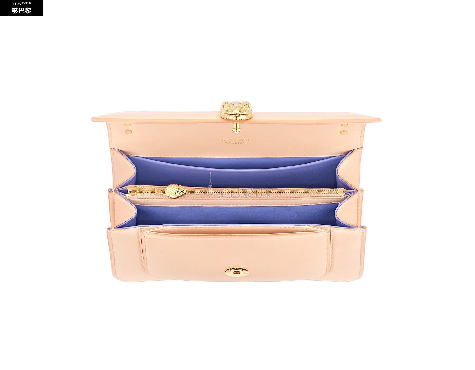 La famille Serpenti Forever accueille un nouveau sac a bandouliere qui affiche une silhouette resolument contemporaine a l’es*W*prit urbain. Confectionne en cuir nappa doux couleur peche, ce sac a chaine maxi arbore des details en laiton dore. Ce modele est orne d'une nouvelle interpretat*w*ion du fermoir Serpenti en laiton dore, inspire par une ancienne montre Bvlgari des annees 60, avec petites ecailles en nacre rose et yeux en email rouge. Clin d’oeil a l’ame du joaillier, une chaine Bvlgari emblematique ton sur ton orne le rabat a l’image d’un collier, qui peut egalement se convertir en une poignee raffinee. Moyen modele avec un compartiment et une bandouliere en cuir detachable et reglable. Une poche ouverte, une poche zippee de separation et un miroir personnalisable completent ce modele a l'interieur. Une poche avant et une poche arriere plaquee parachevent le sac a l'exterieur. Dimensions : 25 x 1