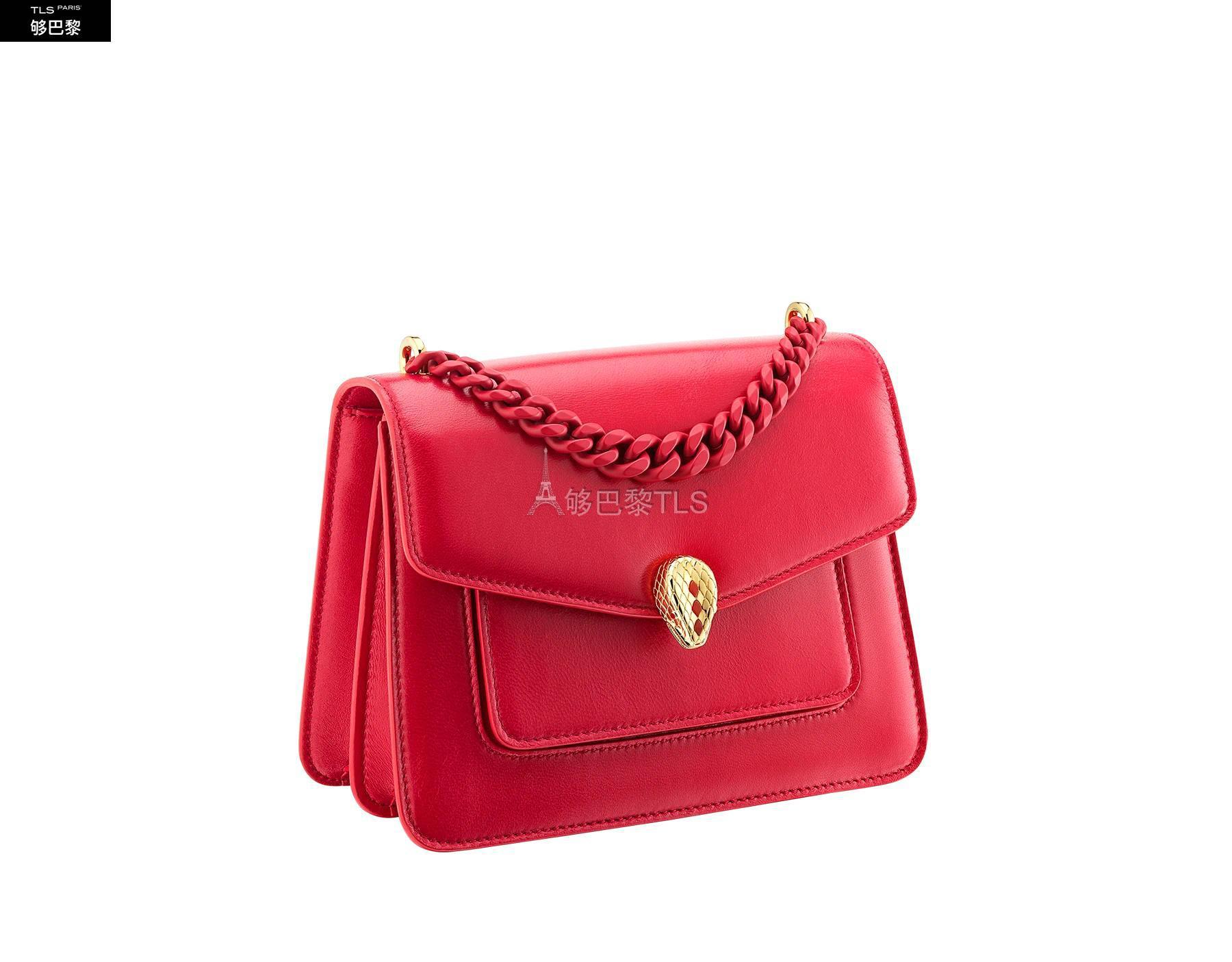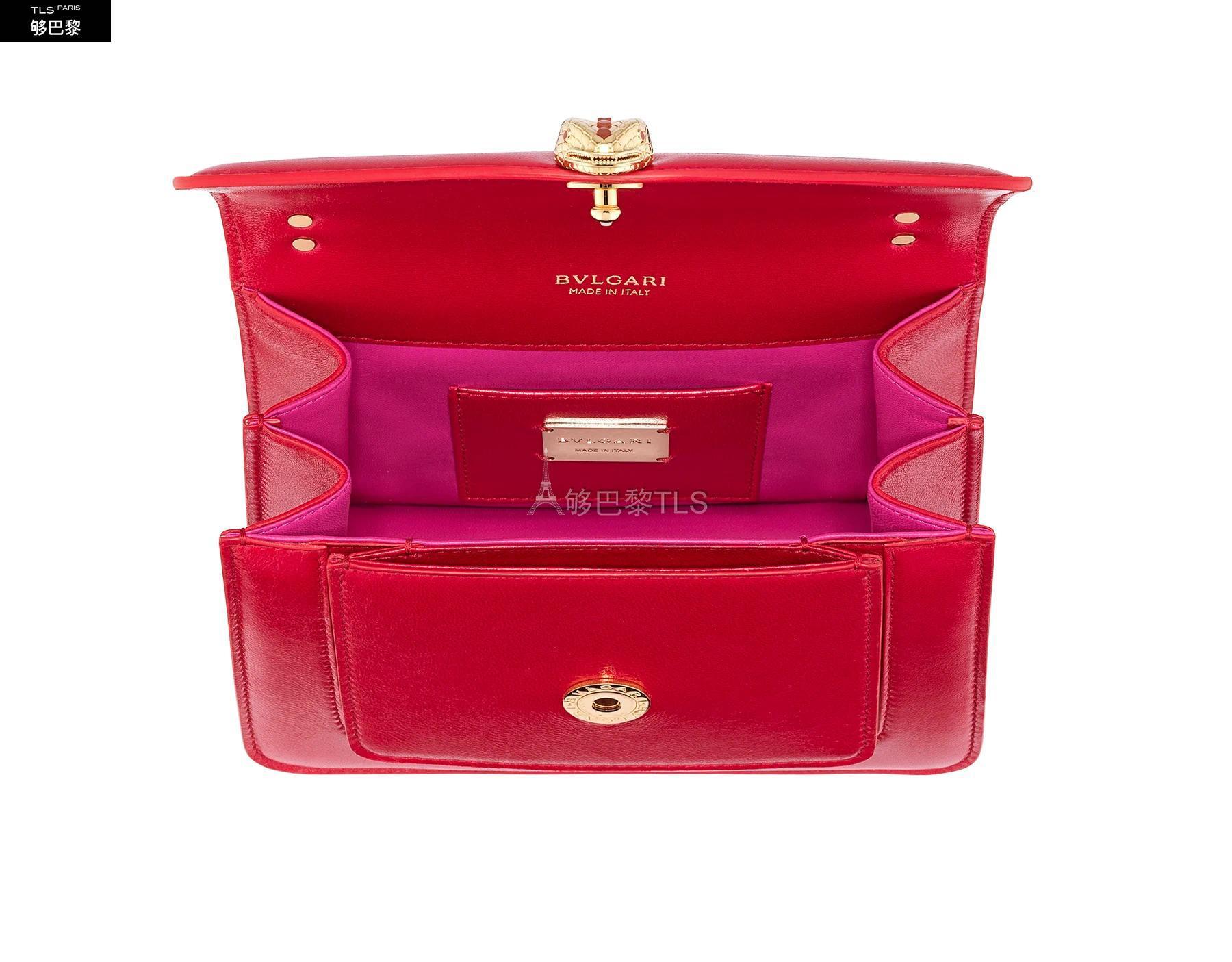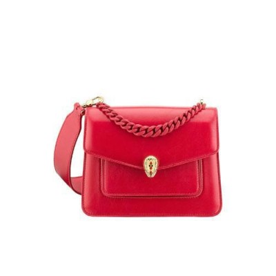 La famille Serpenti Forever accueille un nouveau sac a bandouliere qui affiche une silhouette resolument contemporaine a l’es*W*prit urbain. Confectionne en cuir nappa doux couleur rouge Amaranth Garnet, ce sac a chaine maxi arbore des details en laiton dore. Ce modele est orne d'une nouvelle interpretat*w*ion du fermoir Serpenti en laiton dore, inspire par une ancienne montre Bvlgari des annees 60, avec petites ecailles en cornaline rouge au centre et yeux en email rouge. Clin d’oeil a l’ame du joaillier, une chaine Bvlgari emblematique ton sur ton orne le rabat a l’image d’un collier, qui peut egalement se convertir en une poignee raffinee. Petit modele avec un compartiment et une bandouliere en cuir detachable et reglable. Une poche interieure a miroir, une poche avant, une poche arriere plaquee et un miroir personnalisable completent ce modele. Dimensions : 20 x 14 x 8,5 cm.