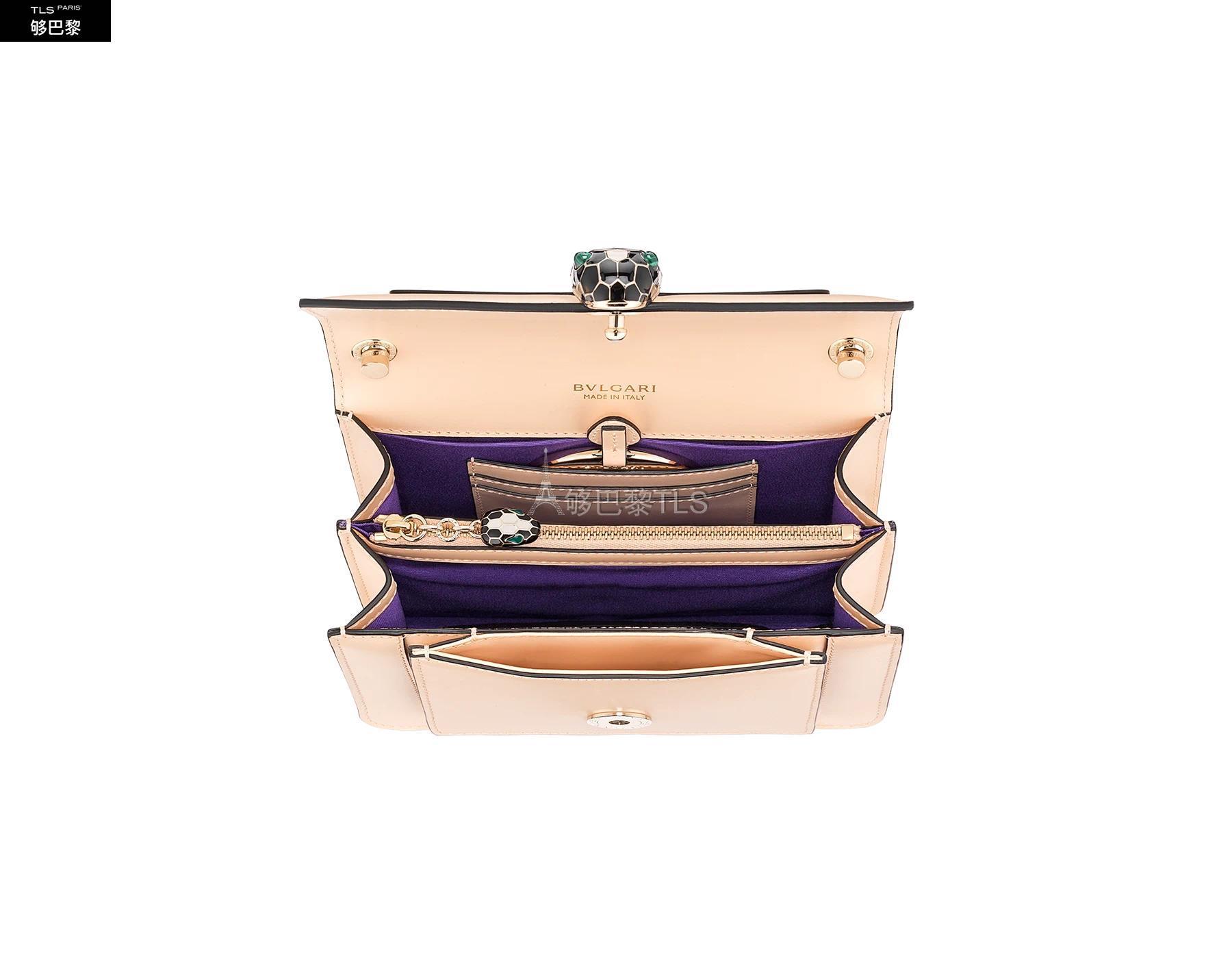 Ideal pour un look urbain, tendance et polyvalent, le nouveau sac a bandouliere Serpenti Forever confere une touche moderne a la collection Serpenti. Confectionne en cuir de veau couleur peche, ce modele est rehausse de details en laiton dore. Le fermoir emblematique Serpenti en email noir et couleur blanc Agate hypnotise avec ses yeux en malachite au cha*W*rme envoutant. Accessoire ideal d’un look de jour tendance, le sac se pare d’une chaine ondulee en forme de serpent ajustable et d’une bandouliere en cuir. Petit modele dote de deux compartiments et d’un petit miroir personnalisable. Un etui pour cartes de credit non amovible, une poche ouverte, une poche a fermeture eclair et deux poches exterieures completent l’ensemble. Dimensions : 19 x 13 x 7 cm.