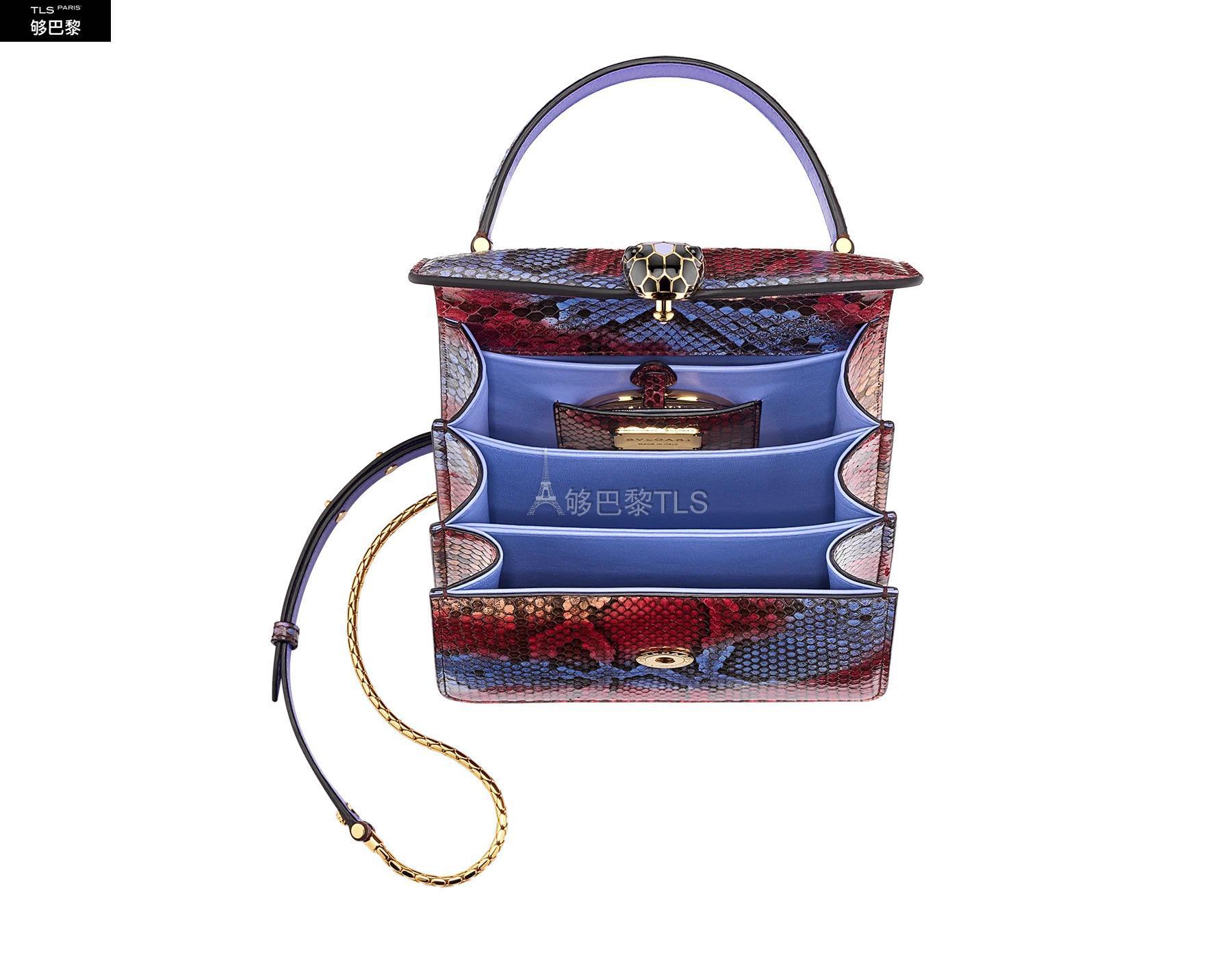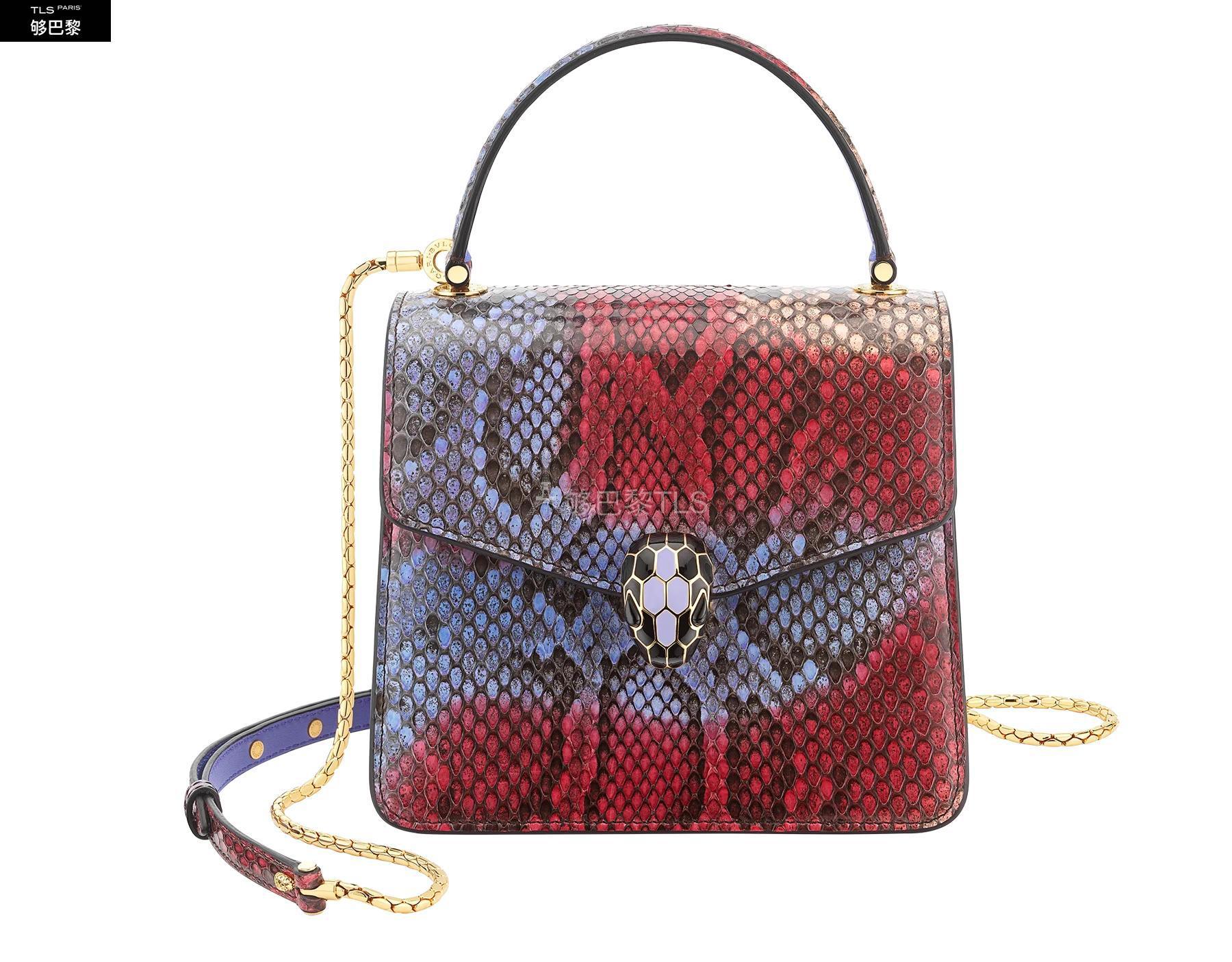 Le sac a main Serpenti Forever est revisite dans un es*W*prit plus contemporain, avec de nouvelles nuances et des materiaux chics pour la saison. Ce modele en python « Chimera » raffine multi*w*colore peint a la main illustre la capacite des artisans Bvlgari a transformer des materiaux precieux en des pieces intemporelles. Le seduisant fermoir Serpenti en email noir et couleur lilas Lavender hypnotise avec ses yeux en onyx au cha*W*rme envoutant. Sac a main dote de trois compartiments et d’une chaine en forme de serpent ajustable et amovible avec bandouliere en cuir pour un look polyvalent. Petit modele avec poche a miroir et poche ouverte a l'interieur, et une poche plaquee a l'exterieur a l’arriere. La plaque en metal ornee du logo Bvlgari a l'interieur et le miroir personnalisable completent l’ensemble a la perfection. Dimensions : 18 x 15 x 9,5 cm.