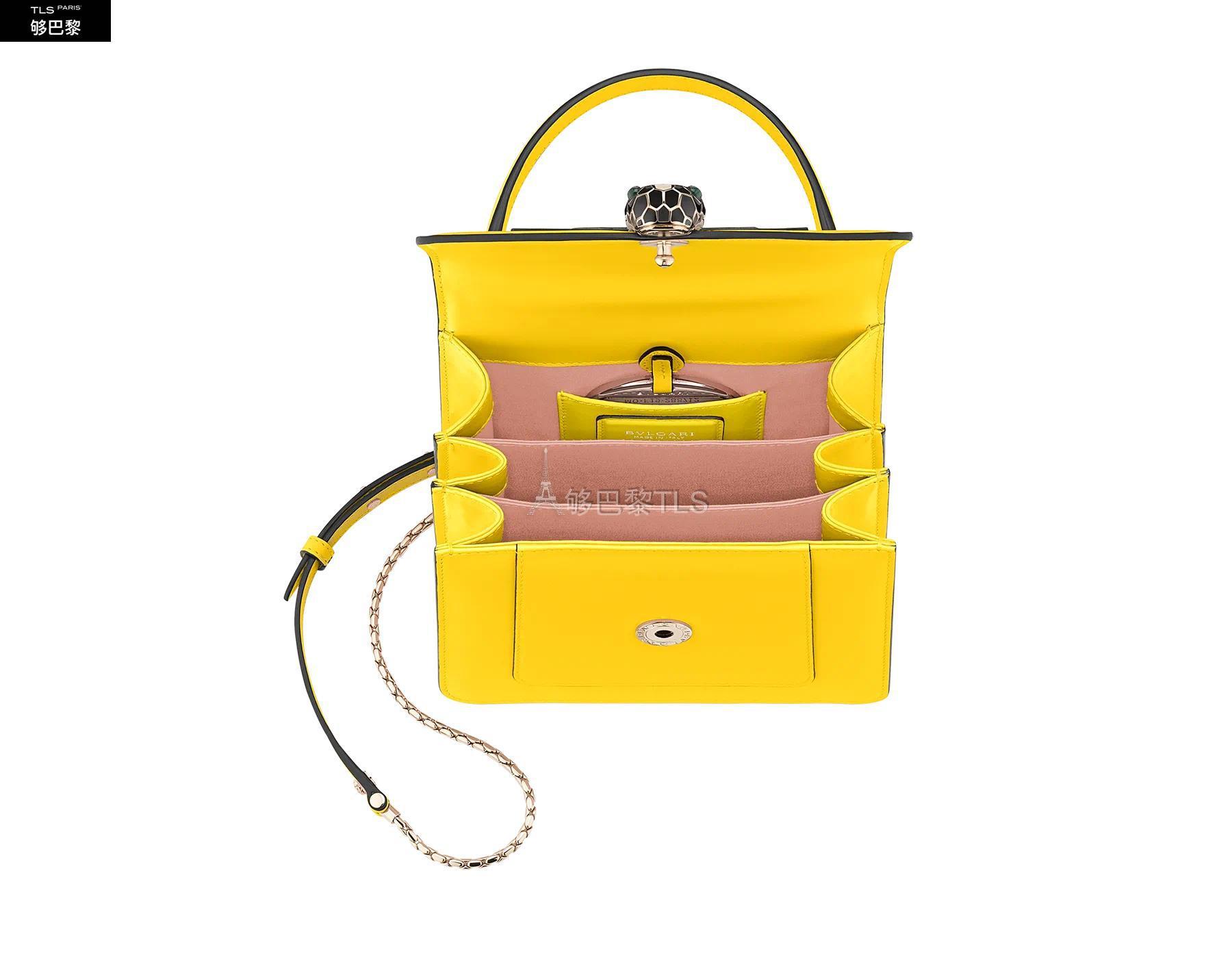 Le sac a bandouliere Serpenti Forever revet de nouvelles couleurs pour la saison. Ce modele en cuir de veau couleur Daisy Topaz est rehausse de details en laiton dore. Le fermoir emblematique Serpenti en email noir et couleur blanc agate hypnotise avec ses yeux en malachite au cha*W*rme envoutant. Sac a main dote de trois compartiments a soufflet et d’une chaine en forme de serpent ajustable et amovible avec bandouliere en cuir pour un look polyvalent. Petit modele dote d’un miroir de poche et d’une plaque en cuir ornee du logo Bvlgari. Dimensions : 18 x 15 x 9,5 cm.